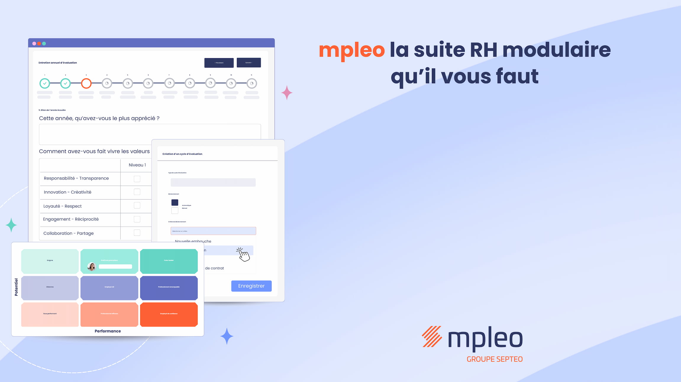 La solution mpleo est une suite logicielle multi-expertise et modulaire permettant de simplifier la gestion des ressources humaines, créant de la valeur en optimisant les processus et en faisant gagner du temps aux utilisateurs. Les différents modules sont interconnectés via une interface intuitive unique ; ils peuvent être activés indépendamment des autres. La suite mpleo peut ainsi répondre à tous les besoins des services RH : recrutementCore RHonboardingentretiensdématérialisationformation, compétences, notes de frais, gestion des temps et des activités